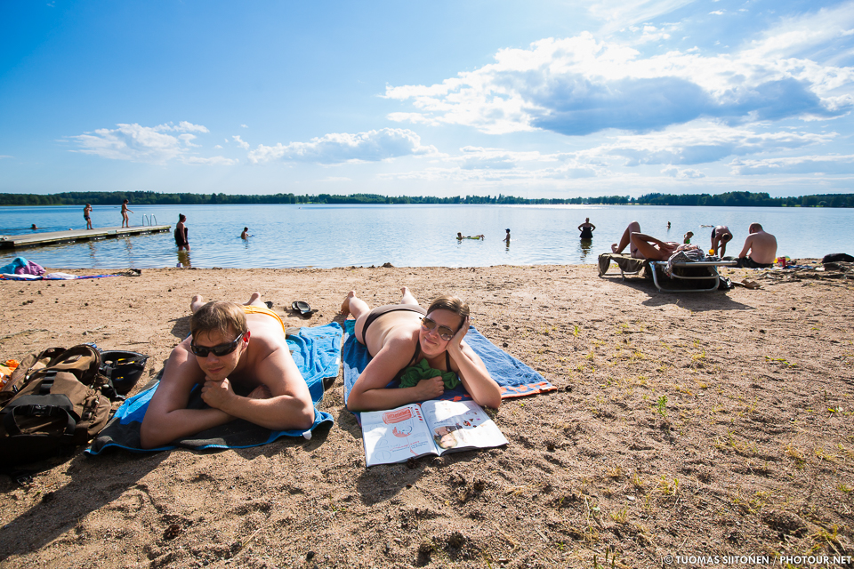 Two beachgoers enjoy a relaxing pause from their bicycle course at Rusutjärvi’s beach in Tuusula.