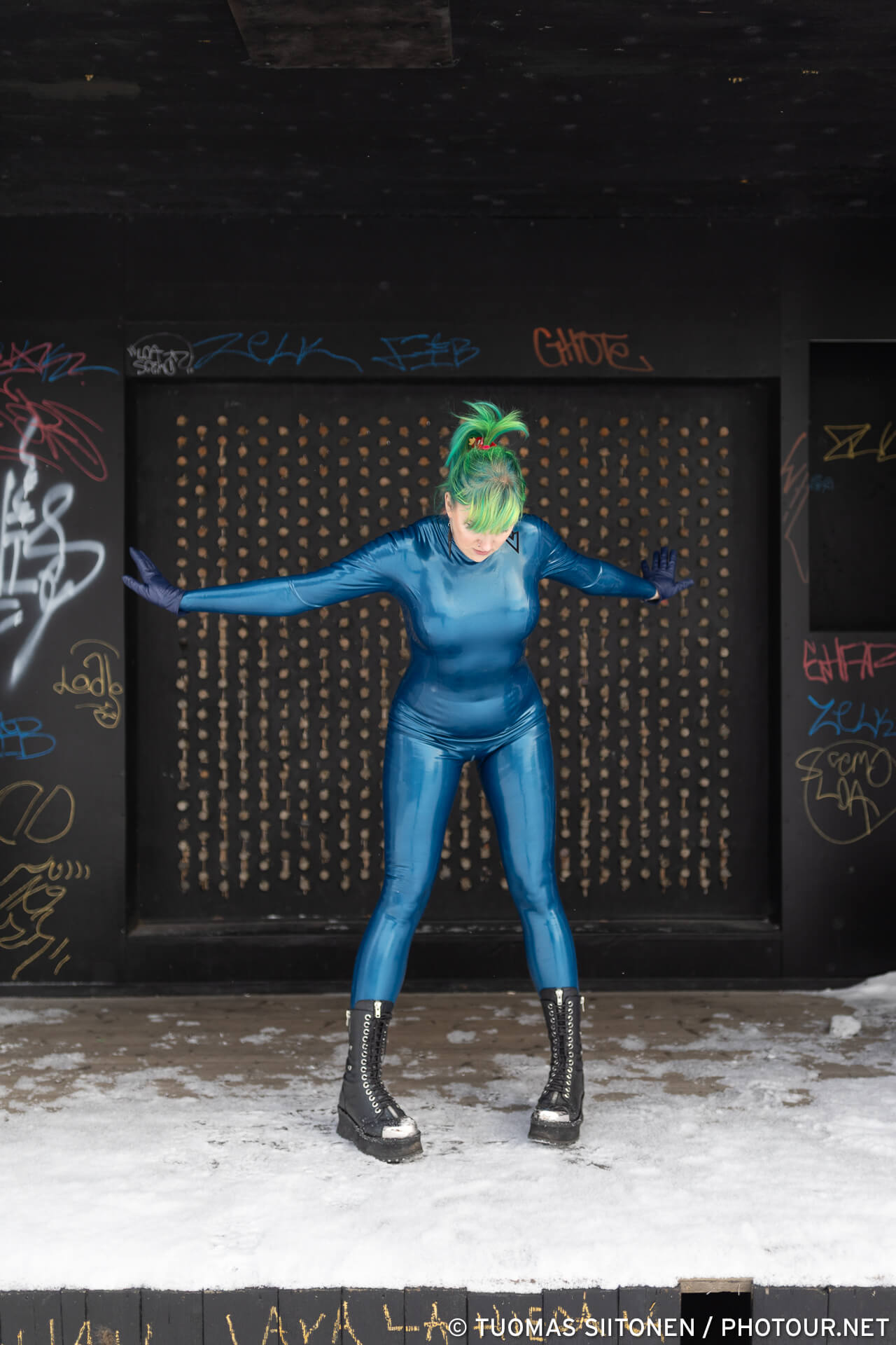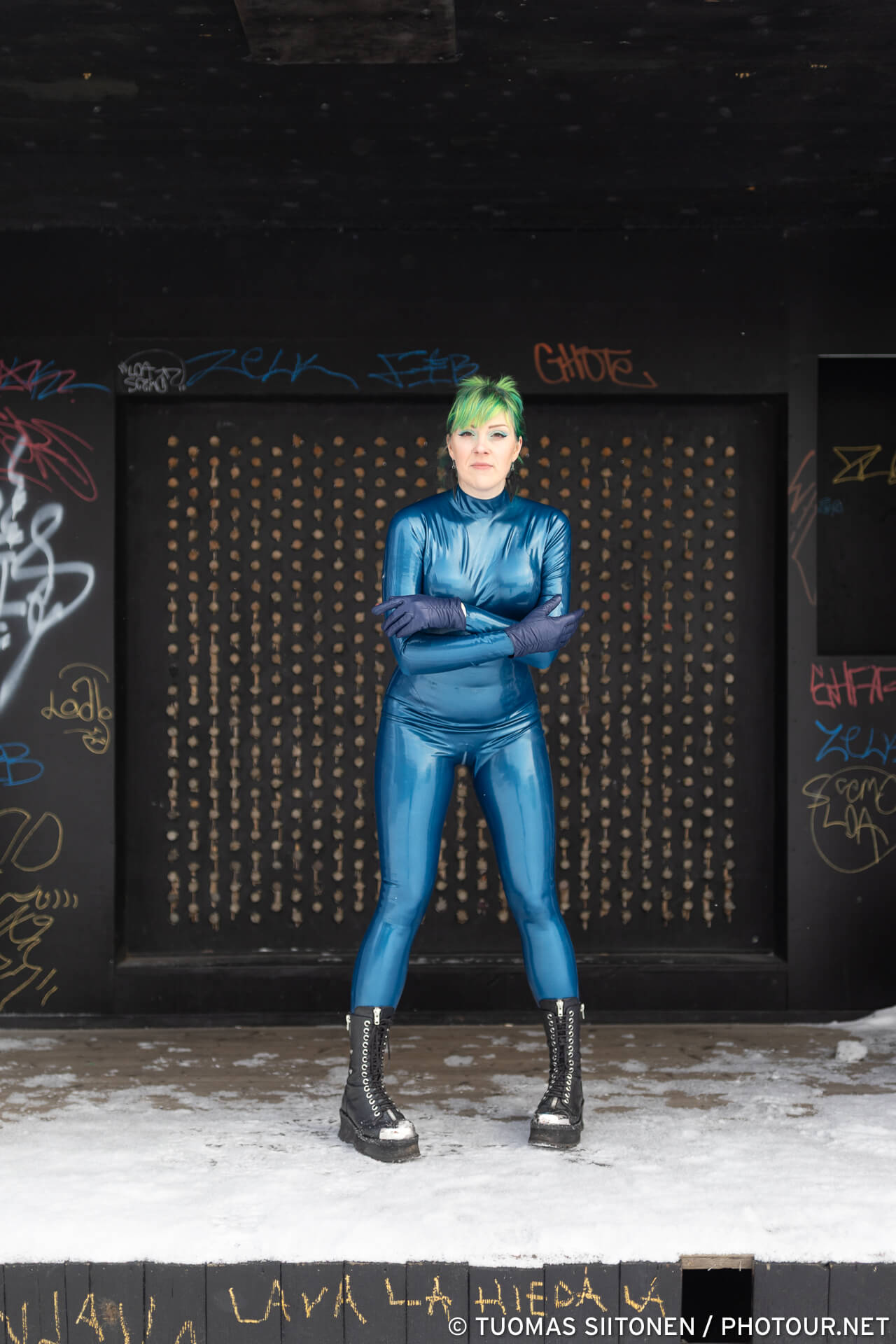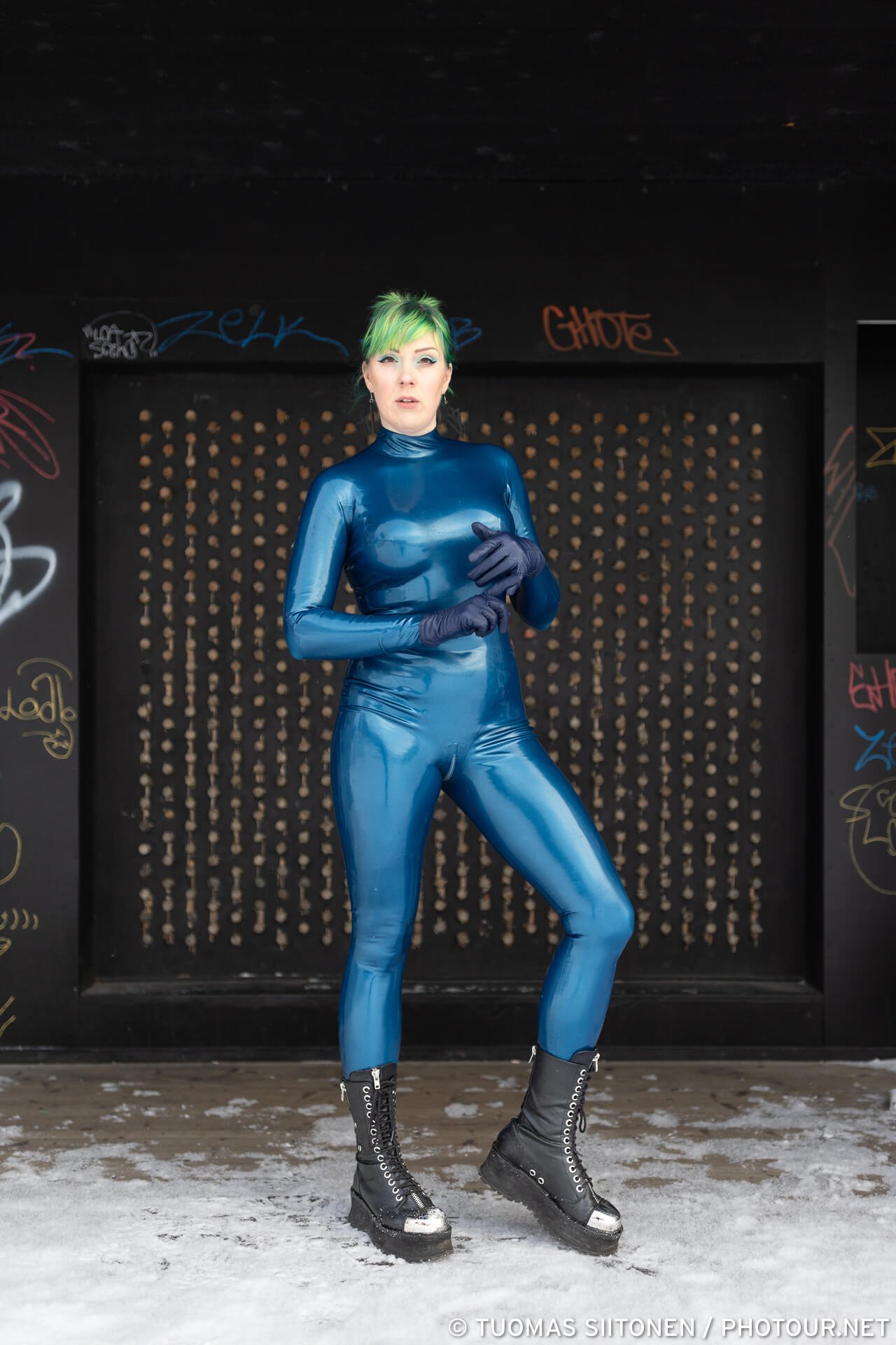 It takes a special kind of someone to go outside in a mere latex catsuit in -15°C (5°F), as latex is a bad insulation against cold, especially when it’s windy – it is, after all, only 0.4 millimetres thin.