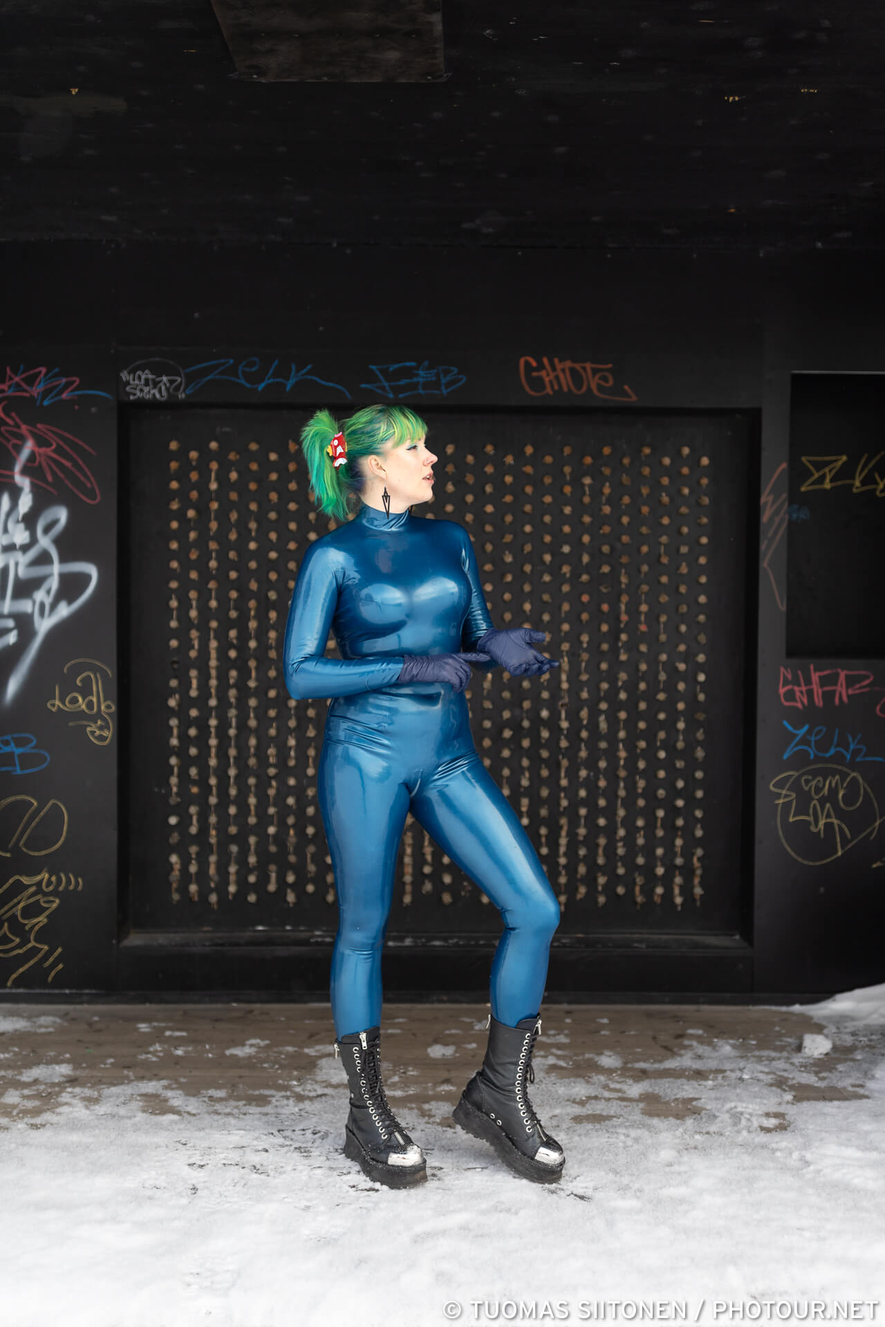 The overcast weather, combined with the surrounding snow-covered ground, gave Didi’s suit quite a shine, even though we did not use any latex polish here.